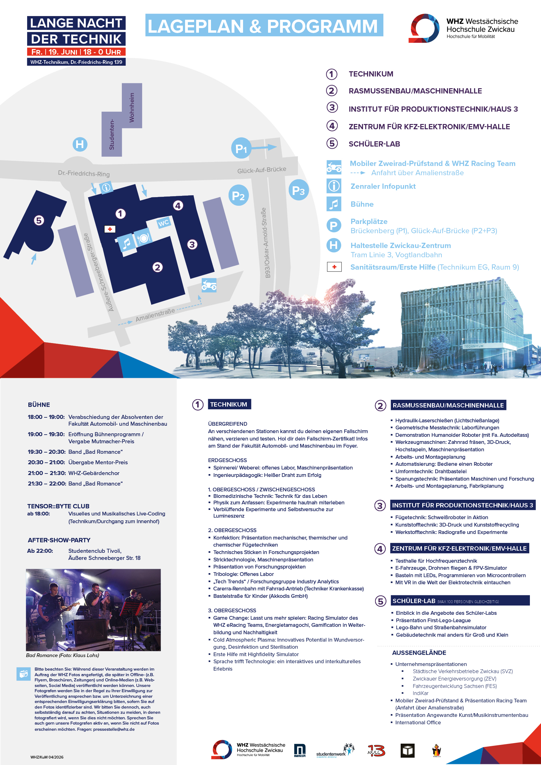 die nächste Lange Nacht der Technik wird am Freitag, dem 19. Juni 2026, 18 - 0 Uhr im Technikum auf dem Innenstadt-Campus (Dr.-Friedrichs-Ring 139, 08056 Zwickau) stattfinden. Alle Infos zum Programm findet ihr ab Frühjahr 2026 hier auf dieser Seite.